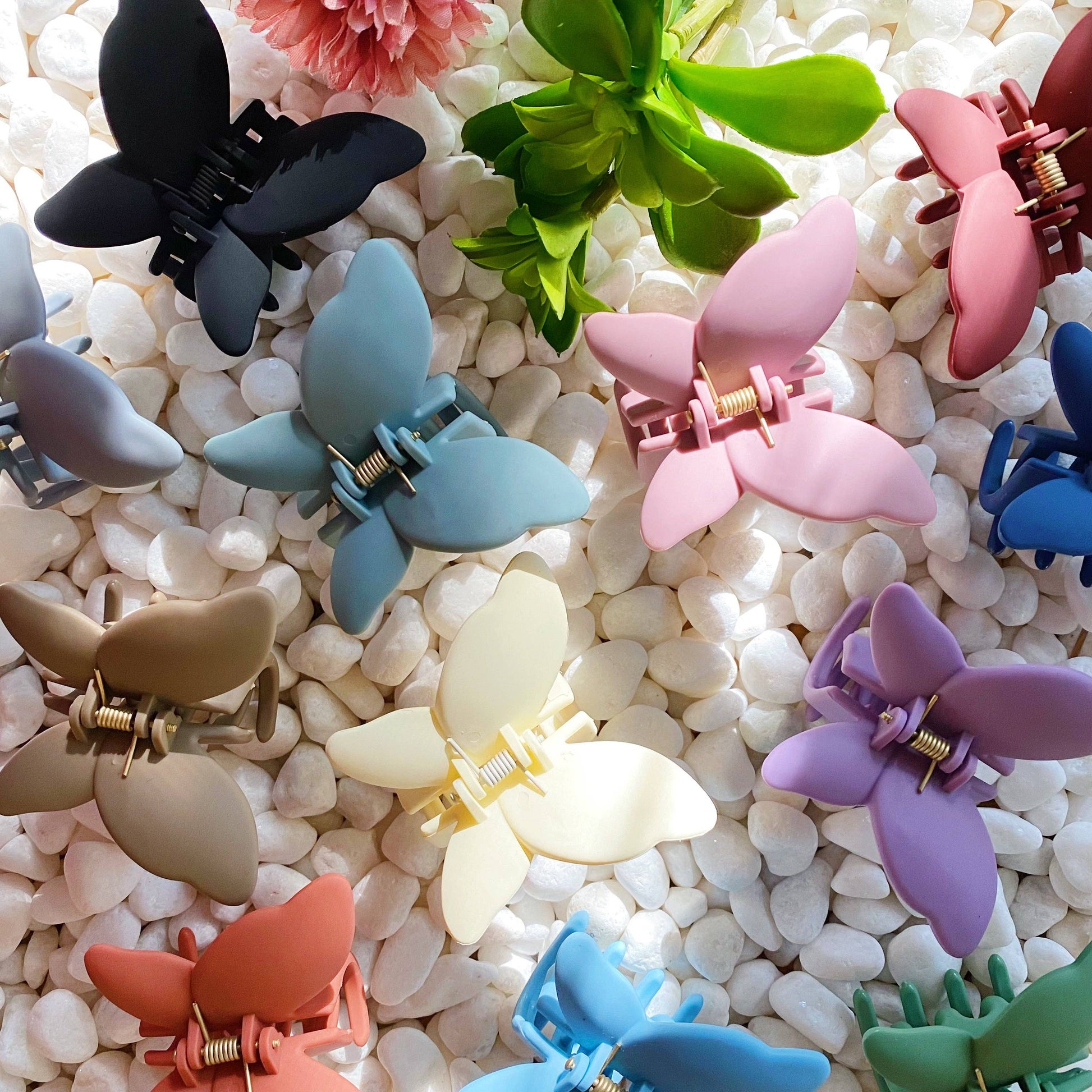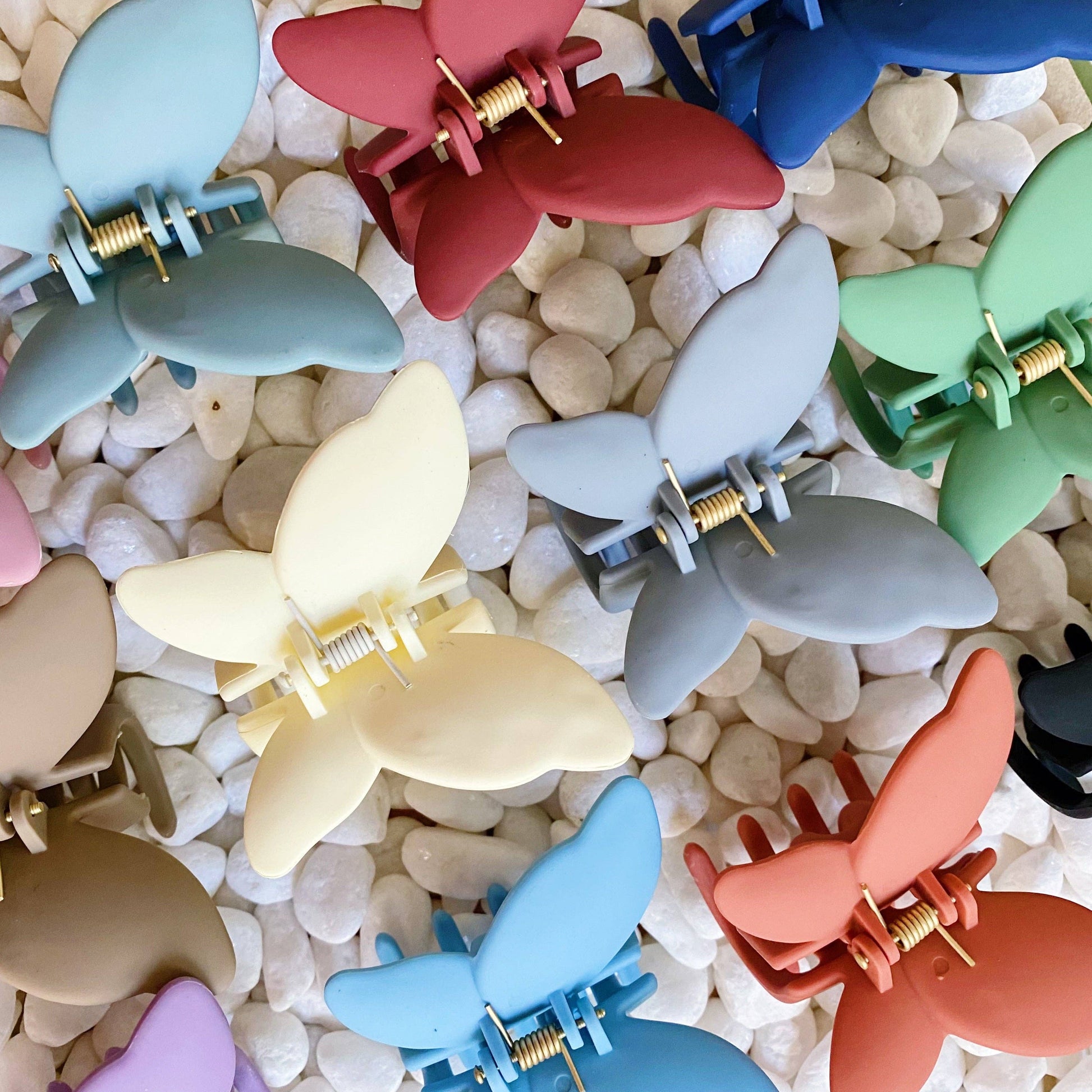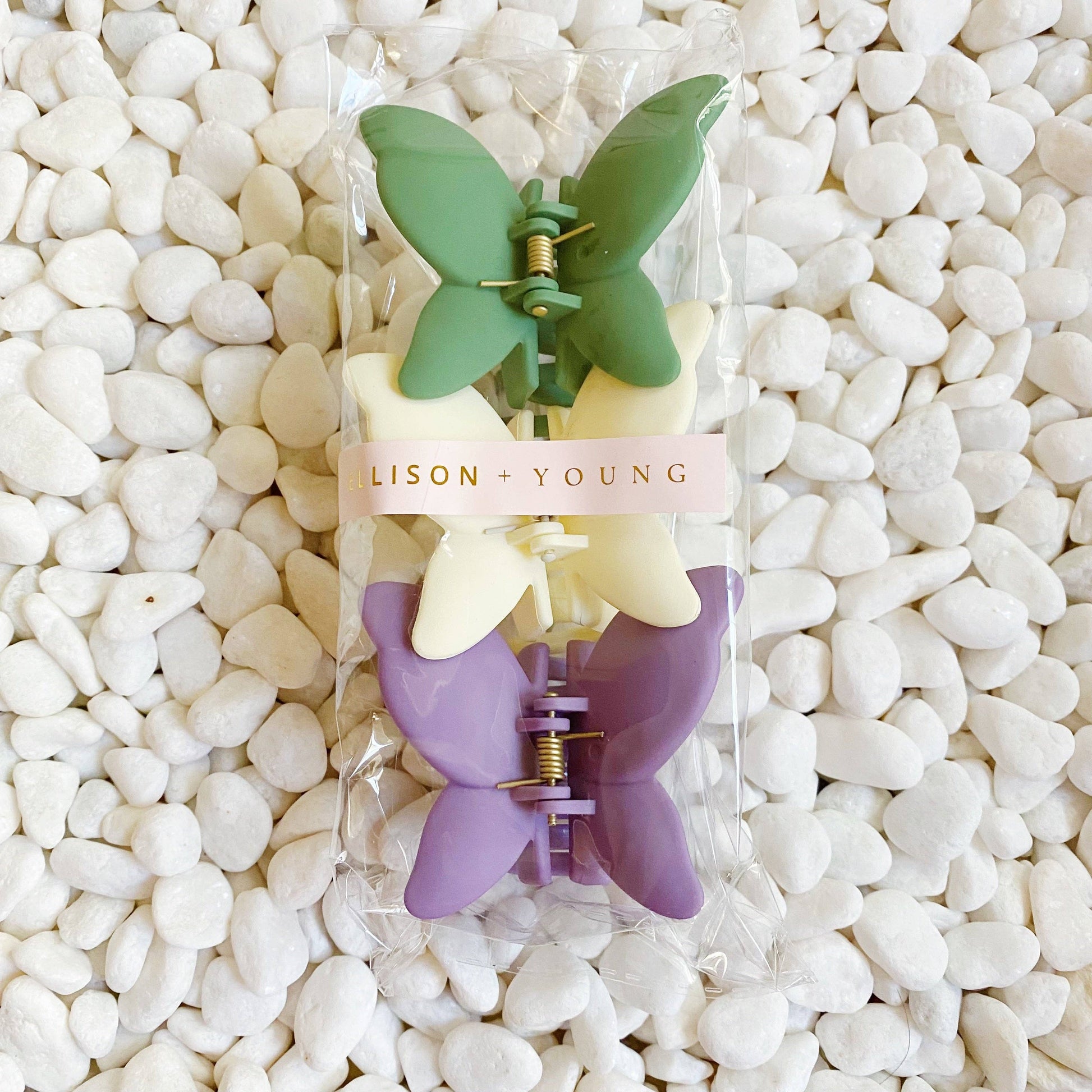 Set of three hair clips. Absolutely beautiful shapes and colors of butterflies in these hair claw sets. Matte color finish looks so clean and pretty! Each set has carefully selected 3 colors and well packaged in clear cello bag with Ellison + Young logo sticker. Medium capacity to hold hair Dimensions: each clip approximately 3 inches x 2.5 inches x 1.5 inches