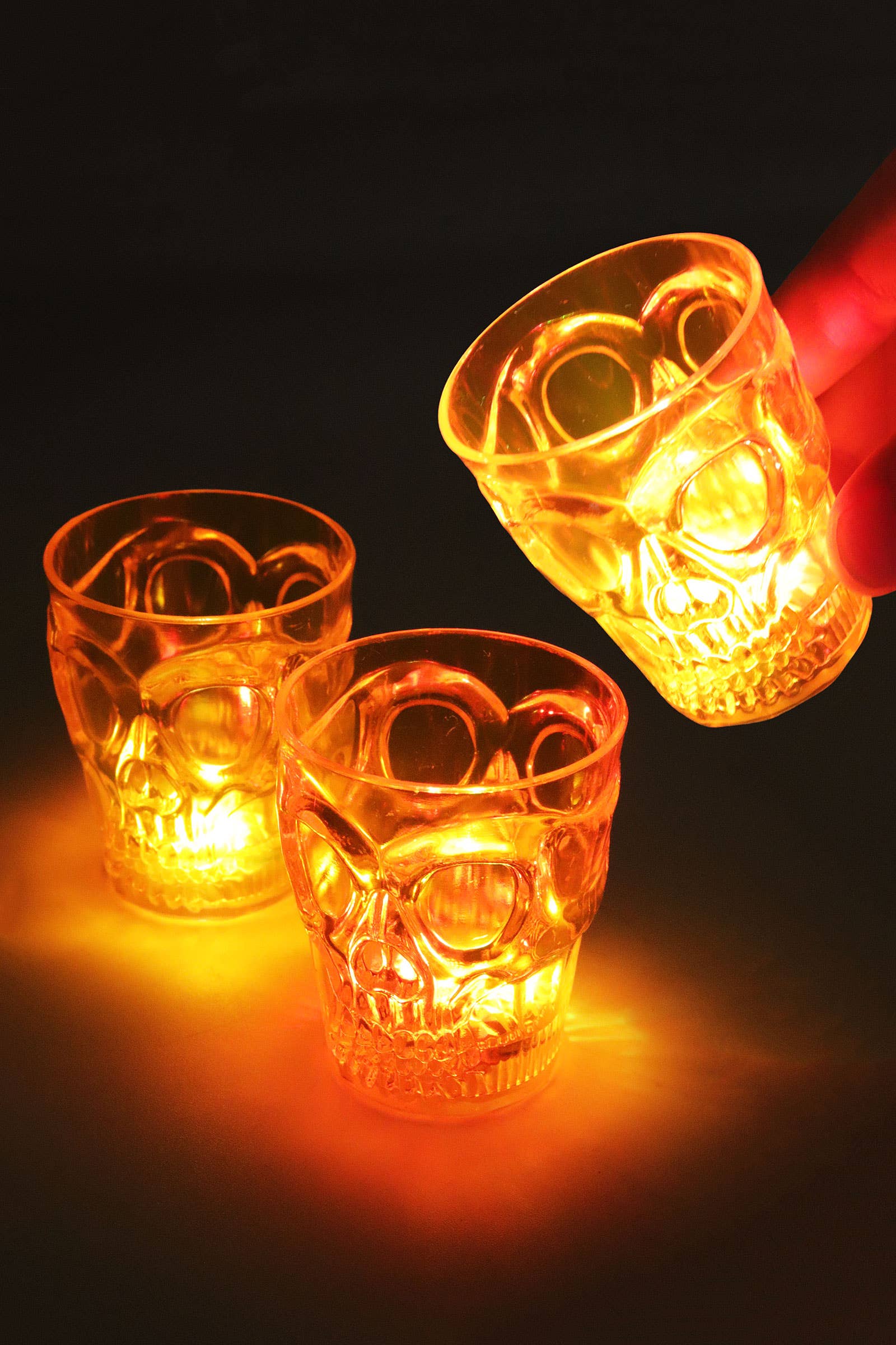 -Raise your spirits-literally-with these LED light-up skull shot glasses! Made from durable plastic and glowing in eerie orange hues, they're the ultimate party essential for your Halloween bash. Perfect for themed drinks, spooky shots, or just adding a ghoulish glow to your table, these mini cups bring frightful fun to every toast. Cheers to a hauntingly good time!