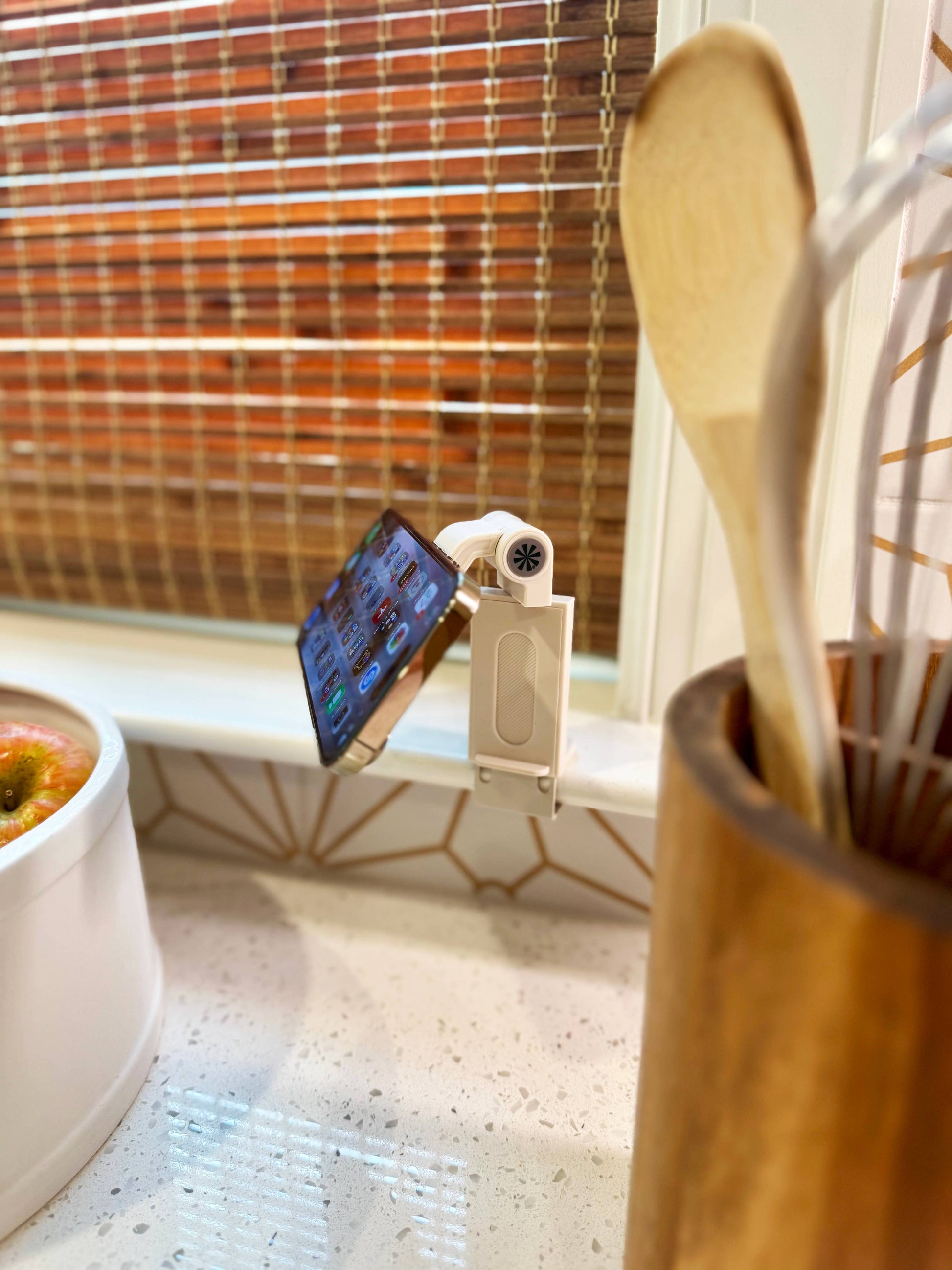 Durable iron clamp plants your phone wherever you want it. Strong intergrated magnet locks it onto the stand. Smooth 360° swivel allows you to fluidly position it how you want it.