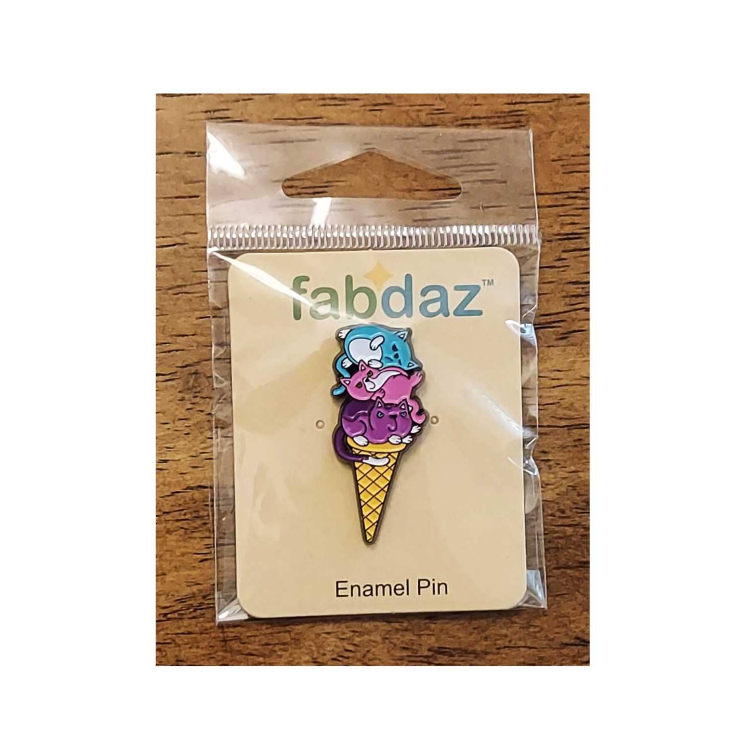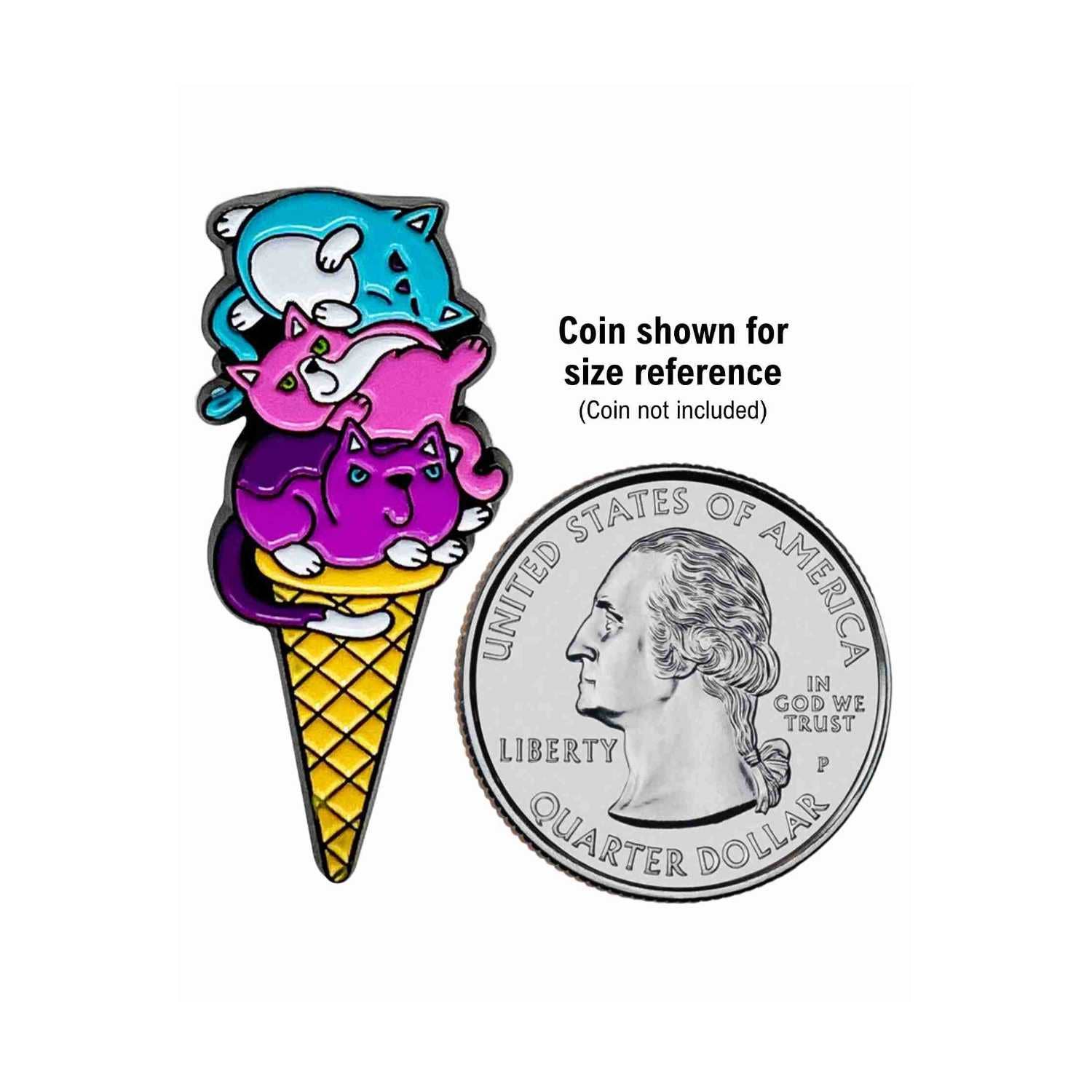 Enamel pin with black metal frame featuring an ice cream cone of cats.