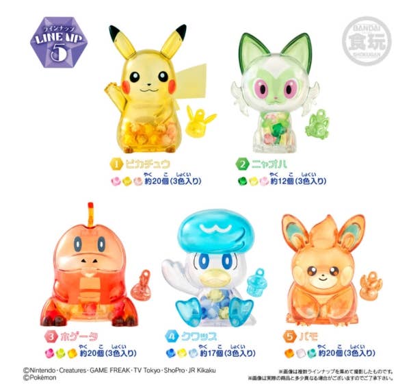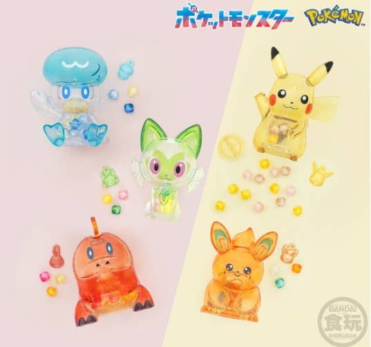 This officially licensed Bandai figure series features your favorite Pokémon in a dazzling crystal-clear style. Each box includes 1 figure, randomly selected from Pikachu, Sprigatito, Fuecoco, Quaxly, or Pawmi. With translucent bodies and bright inner accents, these are perfect for Pokémon fans and collectors.