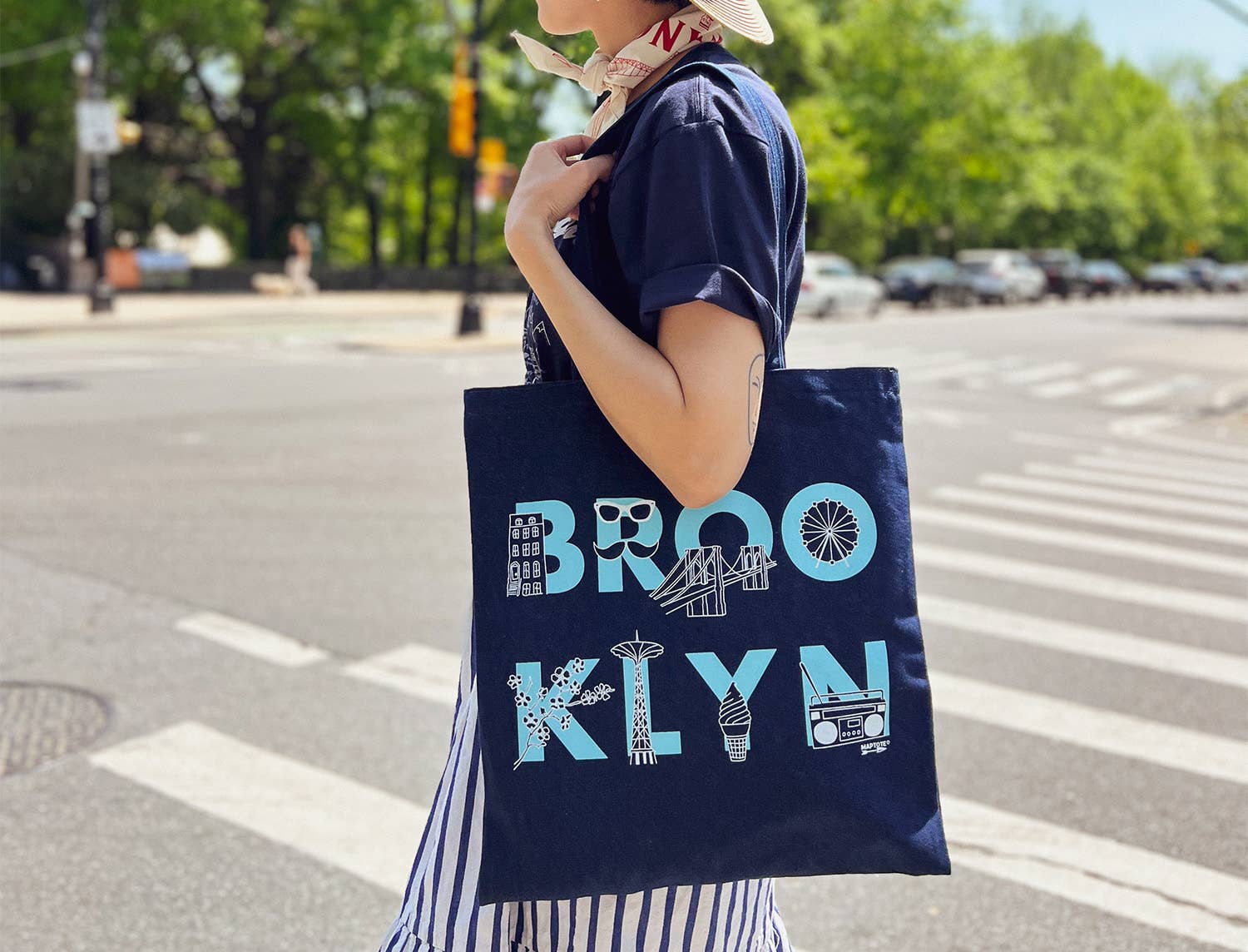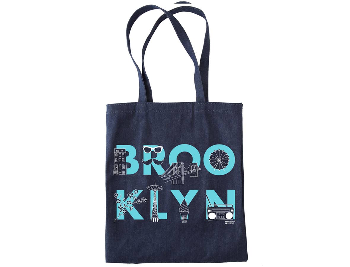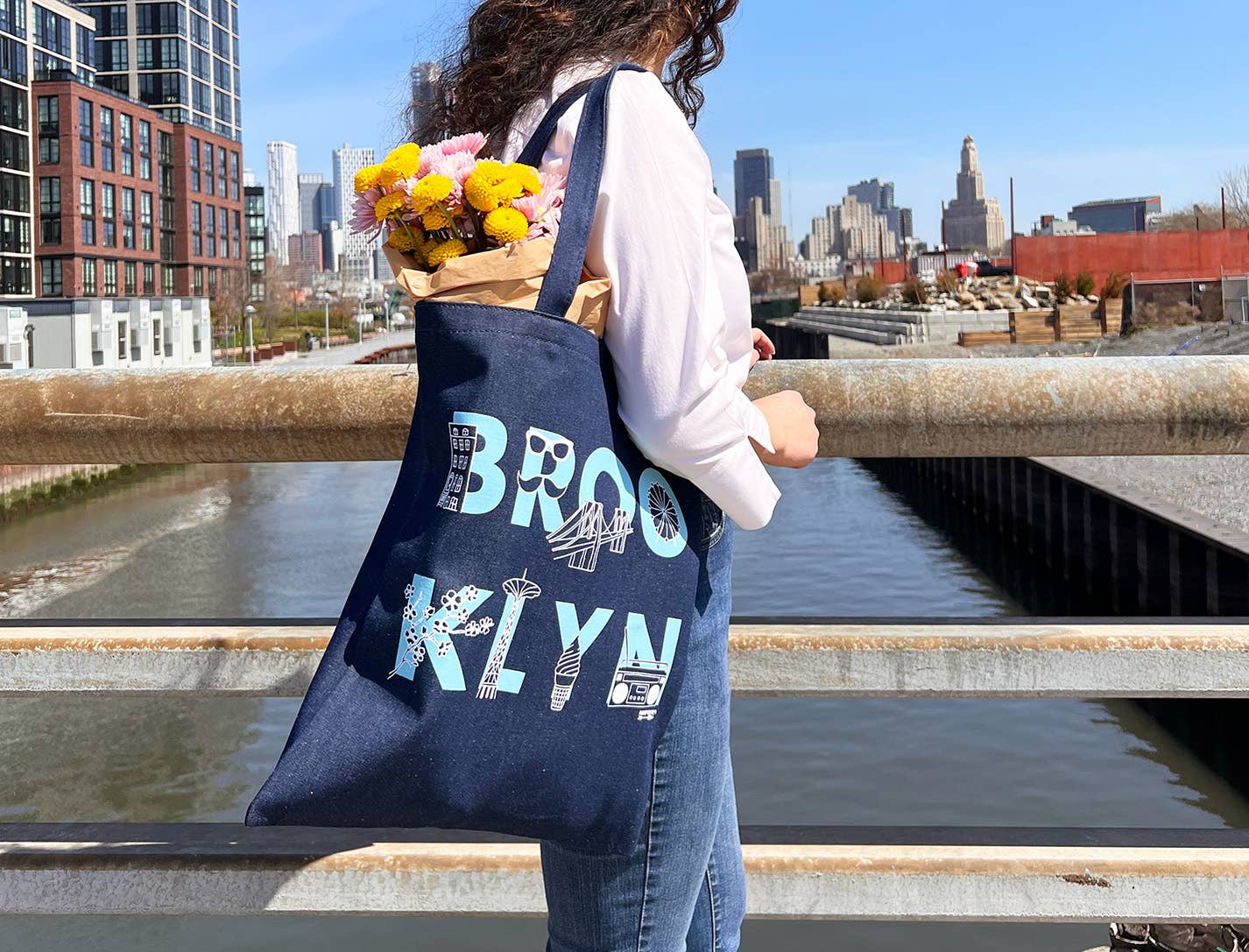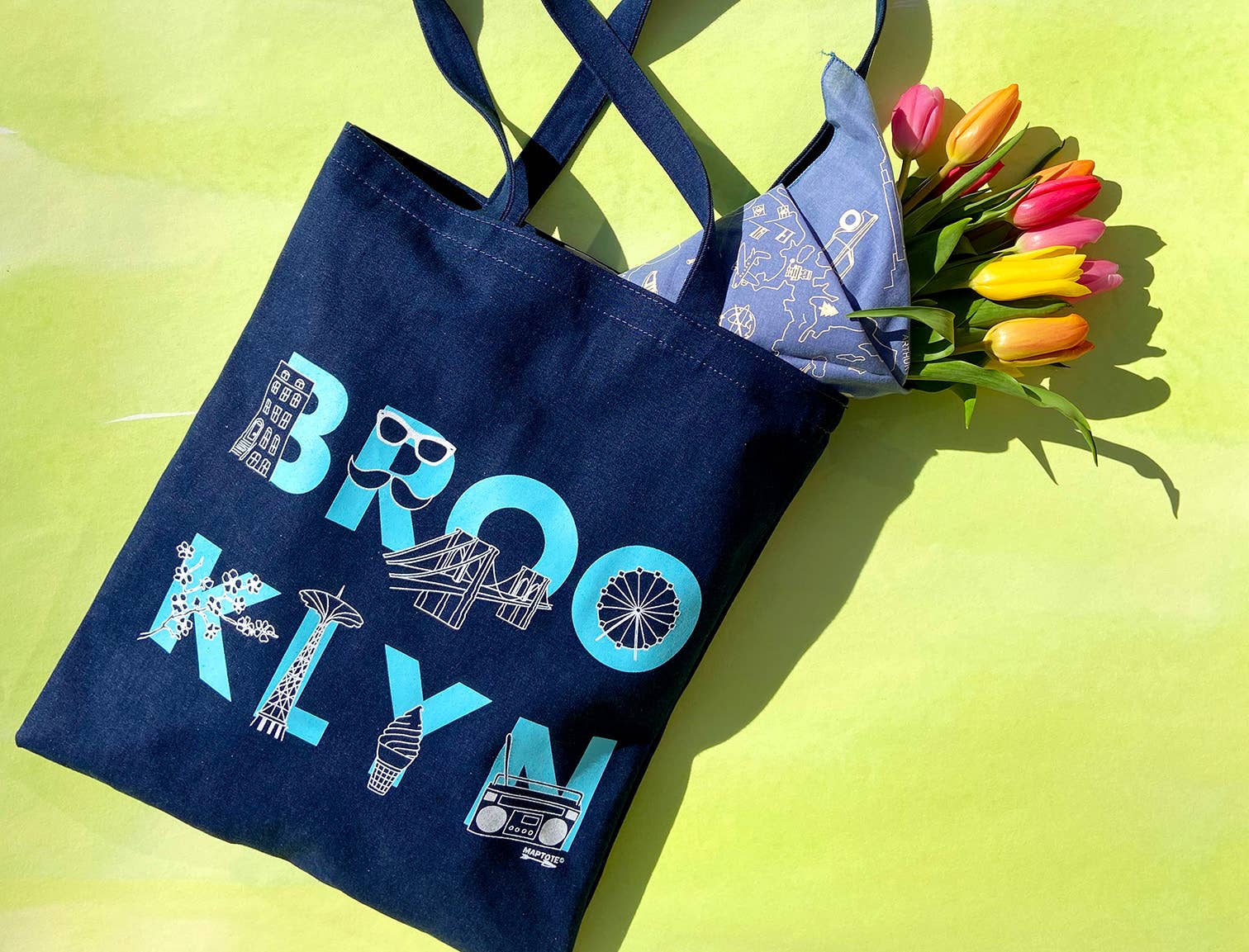 This durable and stylish denim tote bag wears well over time and has a handy inside pocket. Makes for a unique and practical souvenir featuring bold text and icons representing Brooklyn, New York.