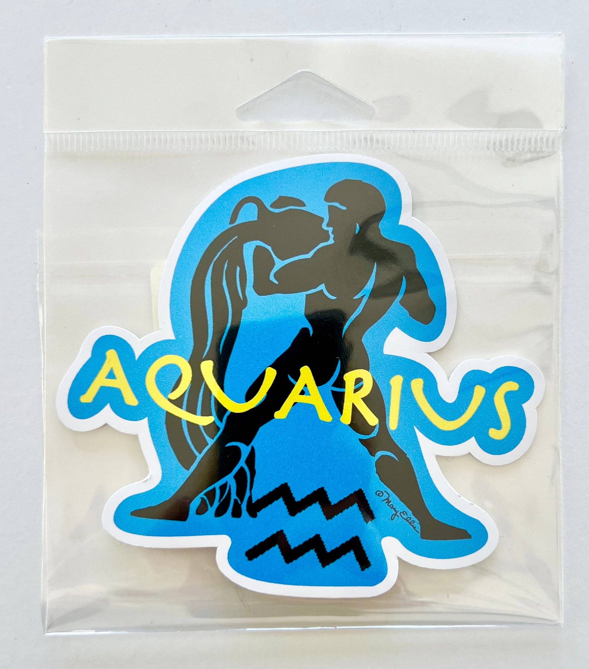 Zodiac Aquarius Sign Giant 4" Sticker with bright and glossy Aquarius Water Bearer Astrology Zodiac Sign artwork by artist Mary Ellis featuring the astrological symbol associated with Aquarius. Perfect to stick on a water bottle, notebook, or wherever you can imagine!