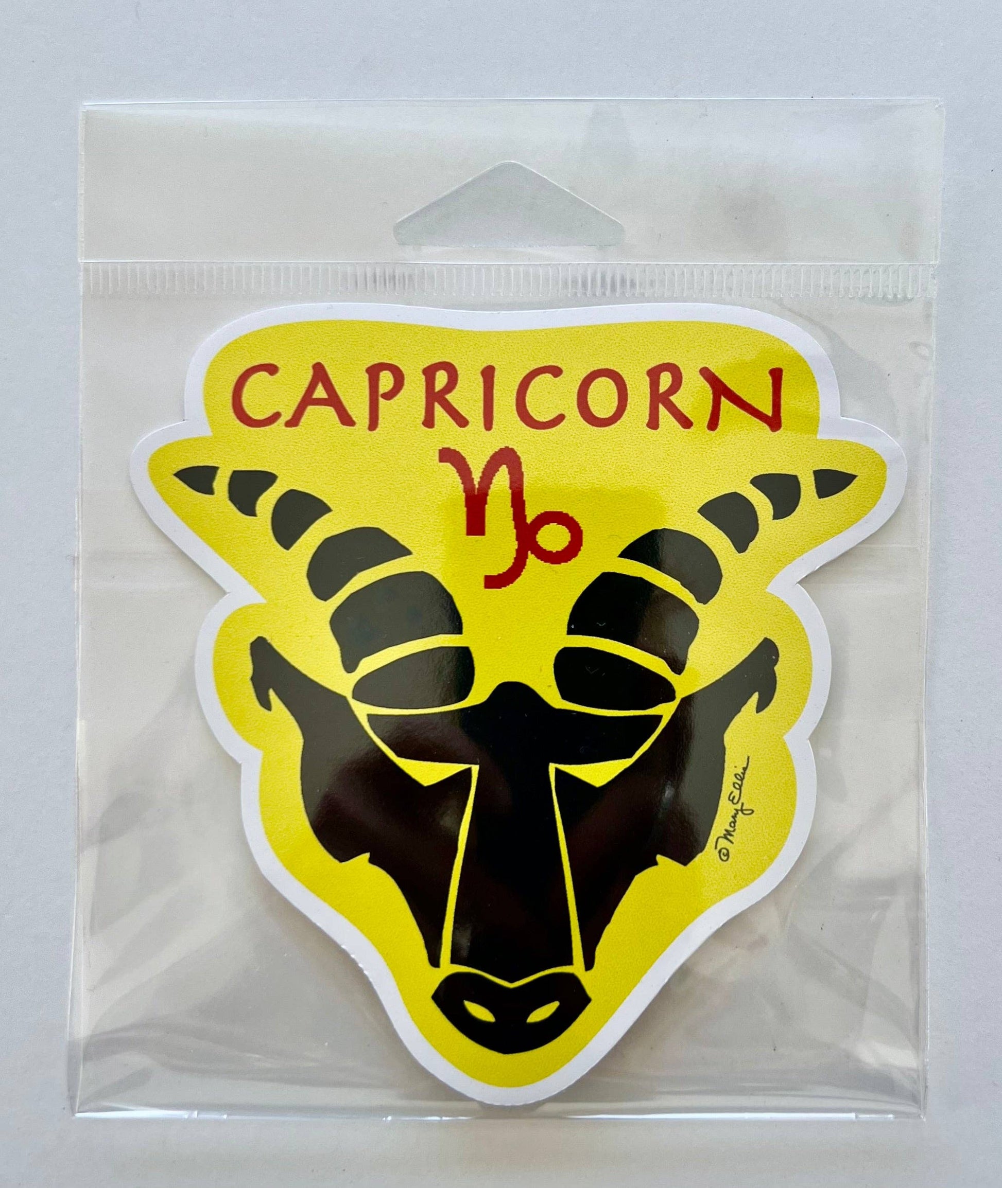 Zodiac Capricorn Sign Giant 4" Sticker with bright and glossy Capricorn Horned Goat Astrology Zodiac Sign artwork by artist Mary Ellis featuring the astrological symbol associated with Capricorn. Perfect to stick on a water bottle, notebook, or wherever you can imagine!