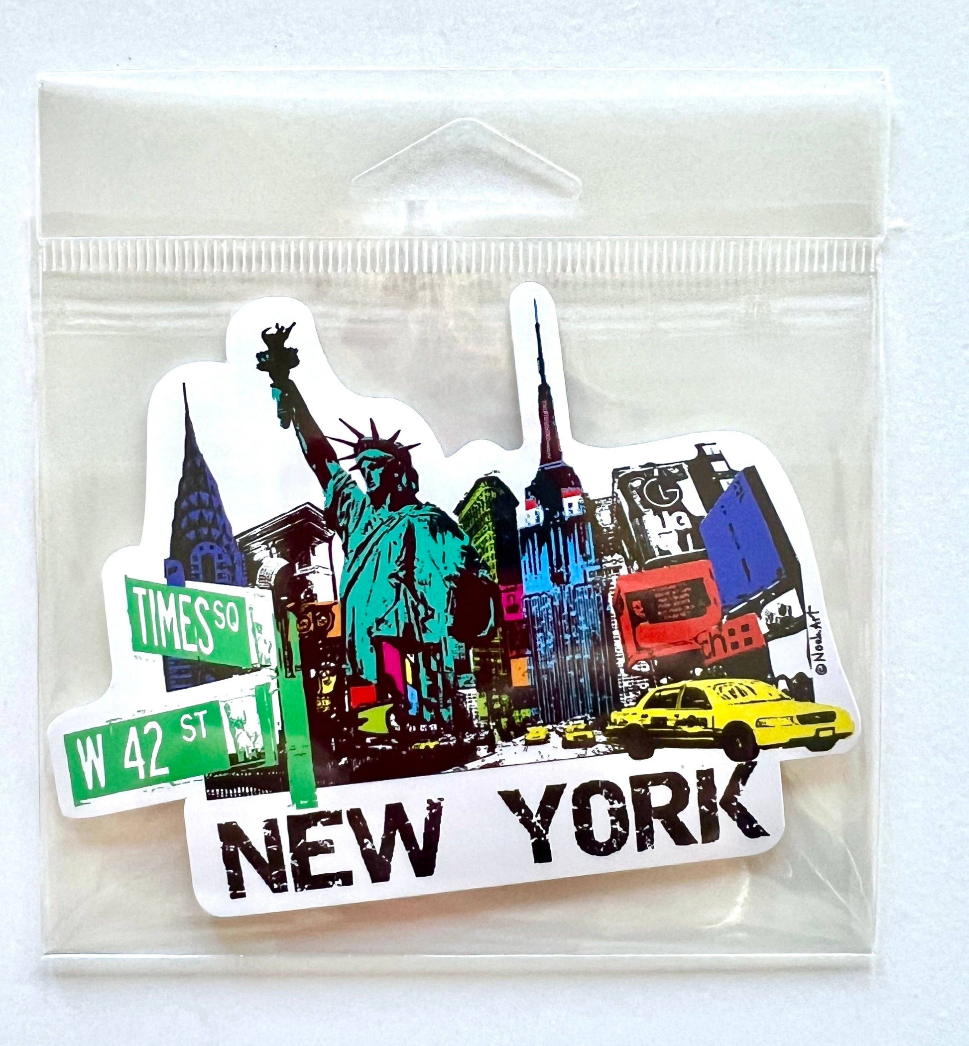 New York Giant 4" Sticker with a bright and glossy Times Square Collage artwork by Noahart. Makes a perfect New York souvenir gift. Celebrate Times Square NYC "the crossroads of the world." Perfect to stick on a water bottle, notebook, or wherever you can imagine!