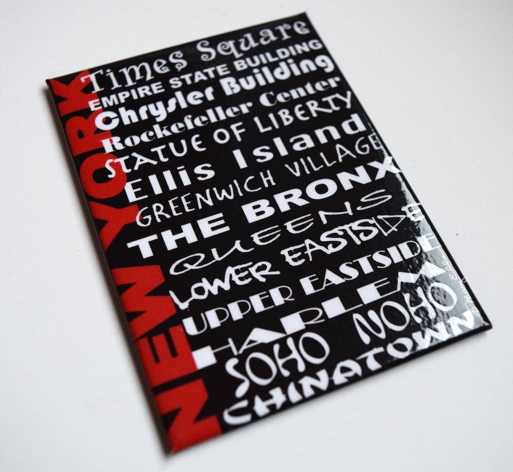 3.5" x 2.5" metal magnet featuring some of the most popular neighborhoods in New York City. Glossy finish and strong full magnetic backing.