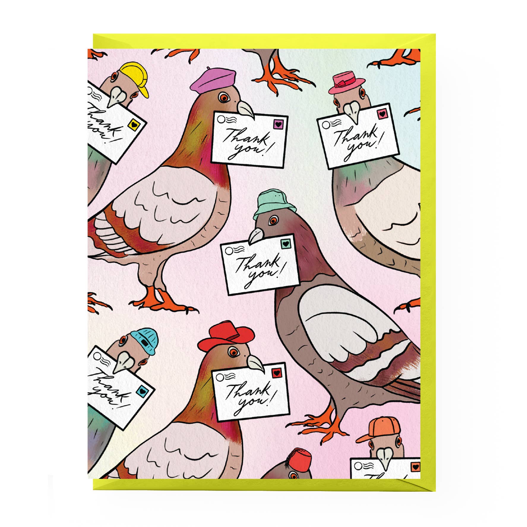 This blank greeting card features an oversized pattern of illustrated pigeons wearing a variety of hats and carrying thank you letters.