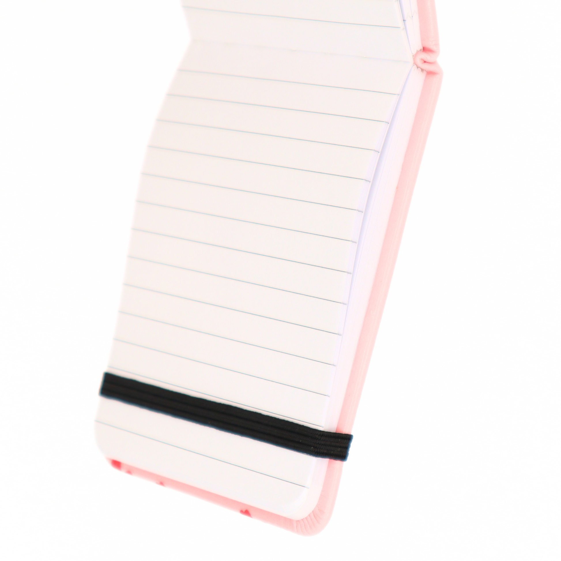 Half the pages are lined and half are unlined. It has an elastic band attached to keep the notebook closed.