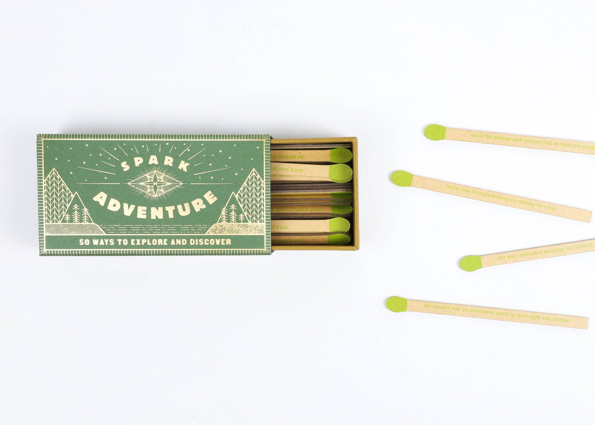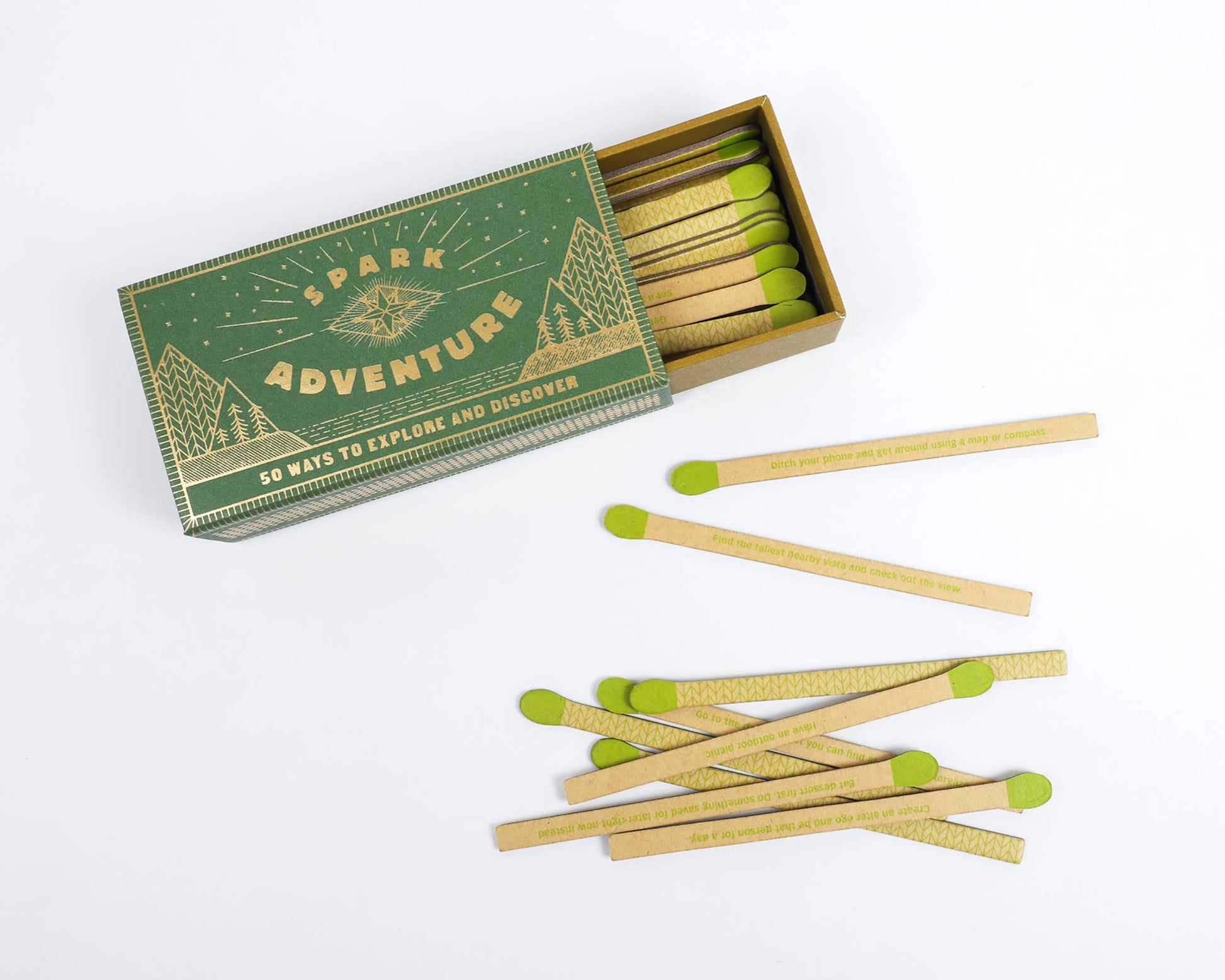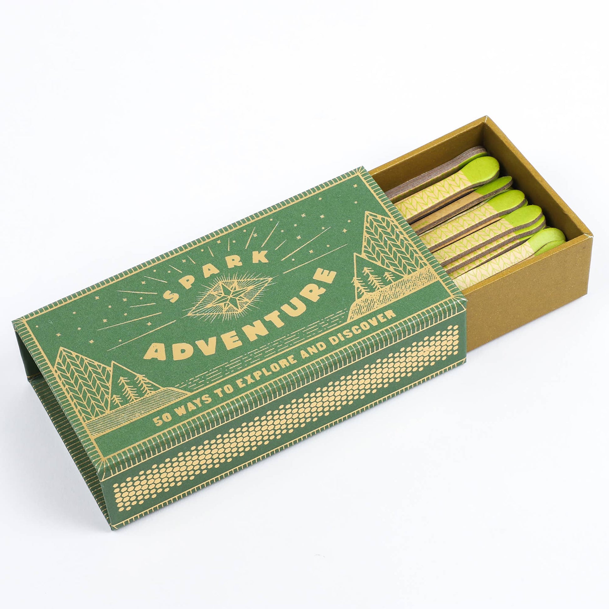 Adventure in a box: accessible prompts in a pick-me-up package that will genuinely spark new experiences and discoveries. A novel gift, this cute faux matchbox box of inspiring prompts is sure to spark exploration and discovery on any journey-whether traveling around the world or just around the block. Includes 50 faux matchsticks with printed prompts.