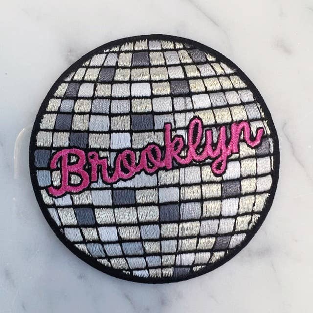 Our Disco Ball Patch i adds a fun touch of sparkle for disco girlies and Brooklyn lovers ! This embroidered iron on patch has Brooklyn in pink against shimmery silvers. A fun gift for party girls or a souvenire that pays homage to the iconic borough in New York City !!